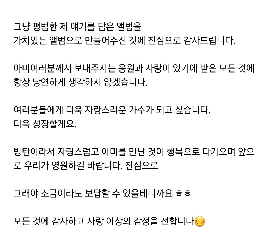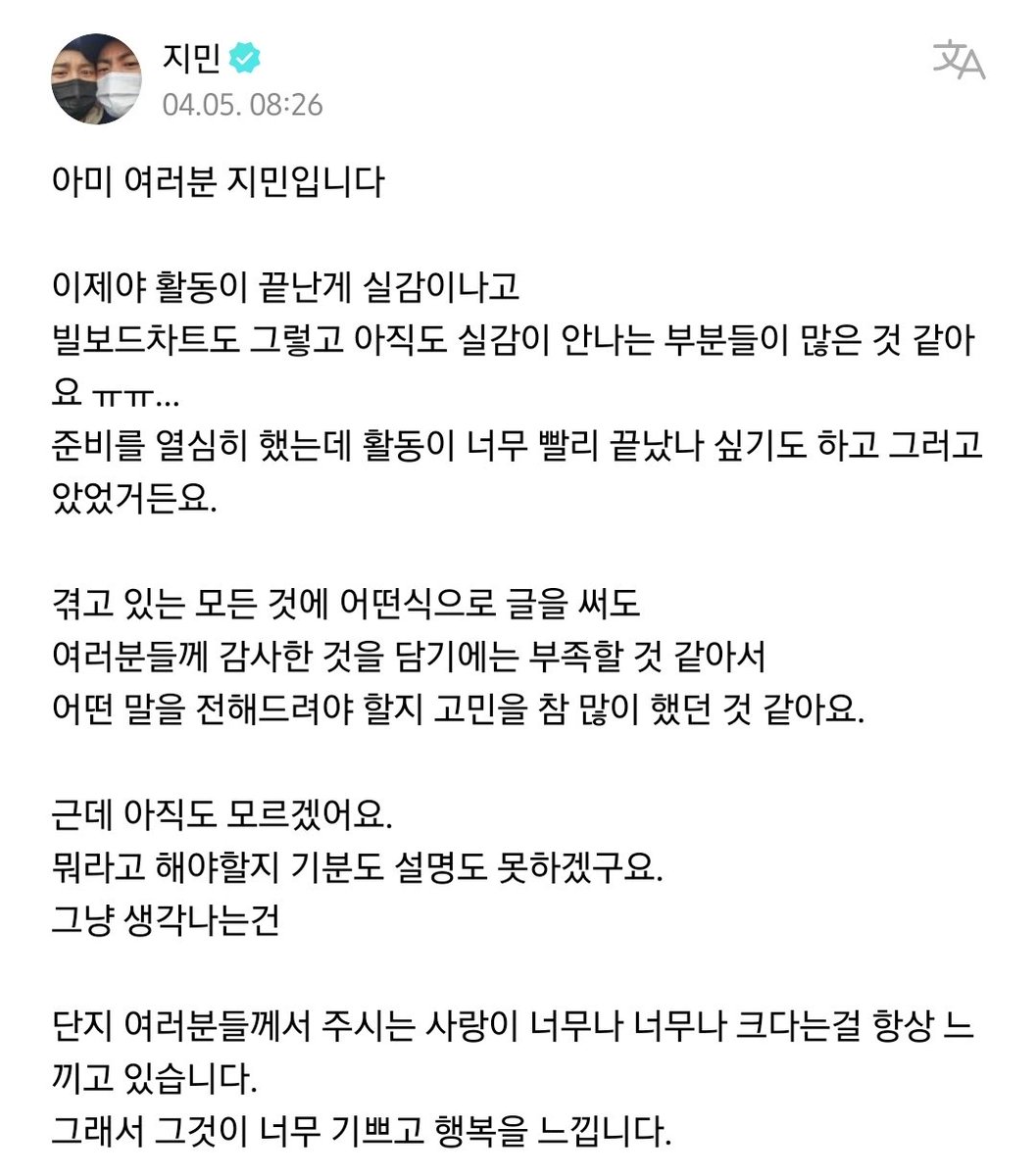 Aku benar2 merasakan/tersadar, aktivitasku sudah selesai. Banyak hal yang masih tidak bisa aku percaya seperti Billboard ㅠㅠ.. Aku mempersiapkan semuanya dengan sungguh-sungguh+