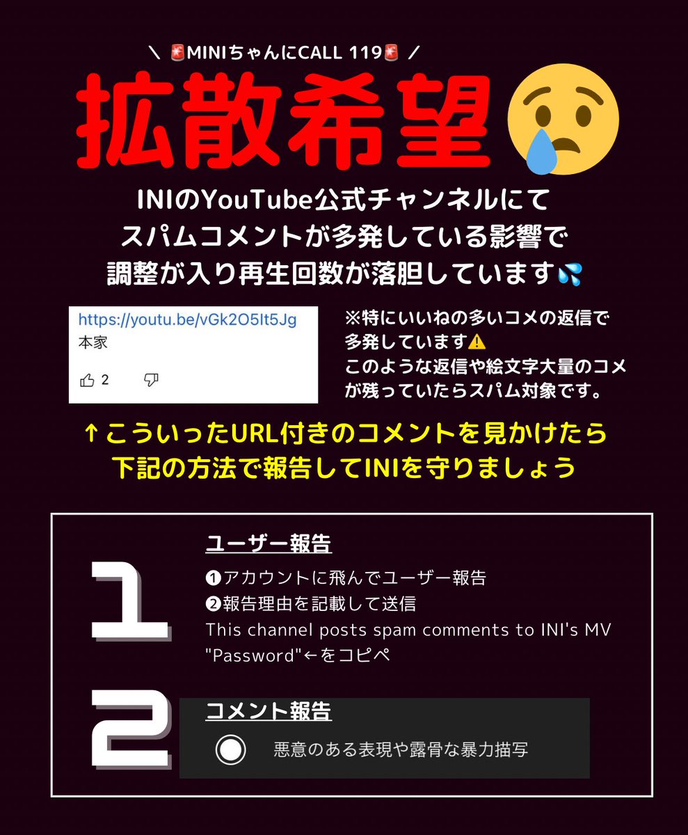 PasswordのMVや今日の公約動画でかなしいことにコメ欄で暴れてるアカウントが発見されてます。INIの努力を踏み躙る行為絶対許せません。