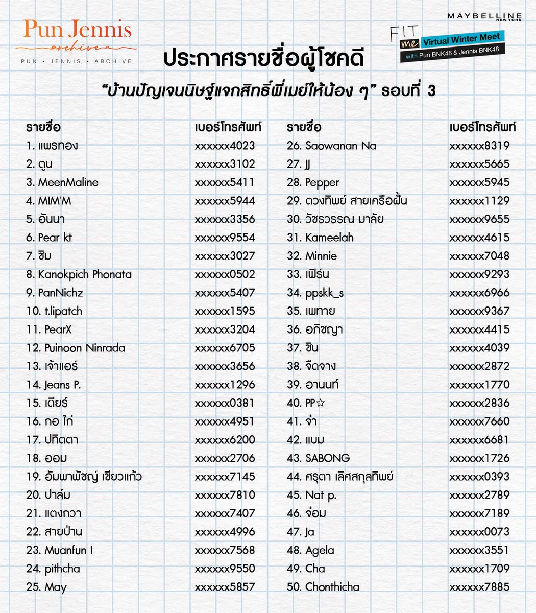 ประกาศรายชื่อผู้โชคดี "บ้านปัญเจนนิษฐ์แจกสิทธิ์พี่เมย์ให้น้อง ๆ" รอบที่ 3