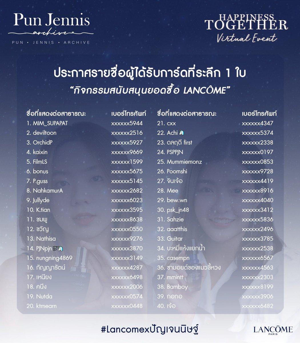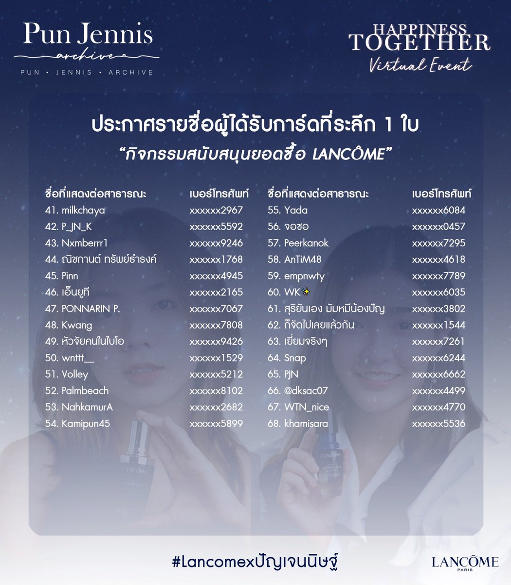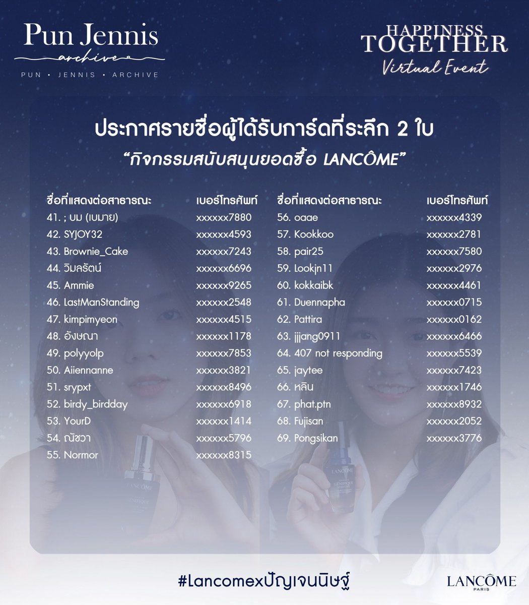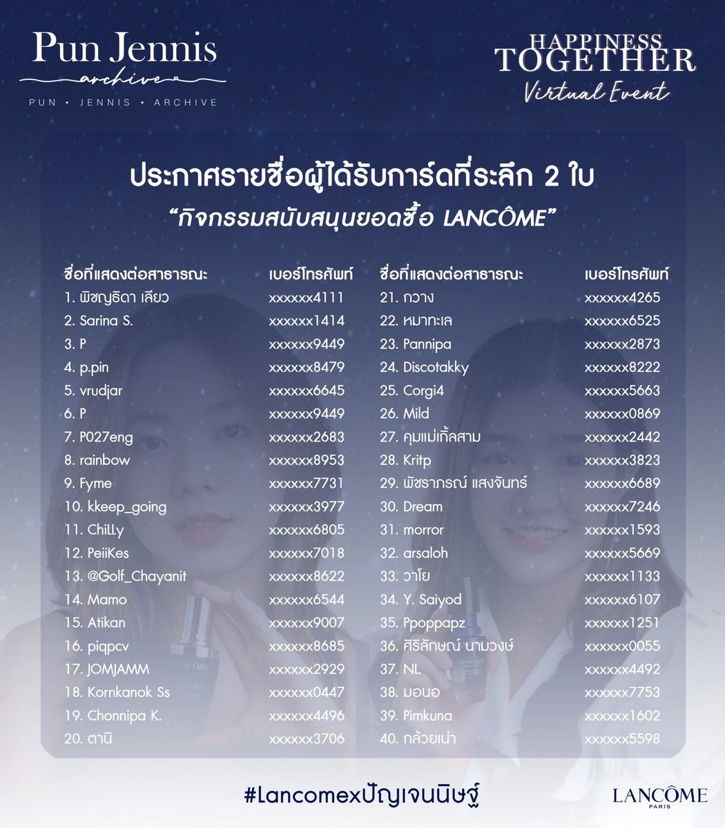 ประกาศรายชื่อผู้ที่ได้รับการ์ดที่ระลึกจากกิจกรรมสนับสนุนยอด Lancôme