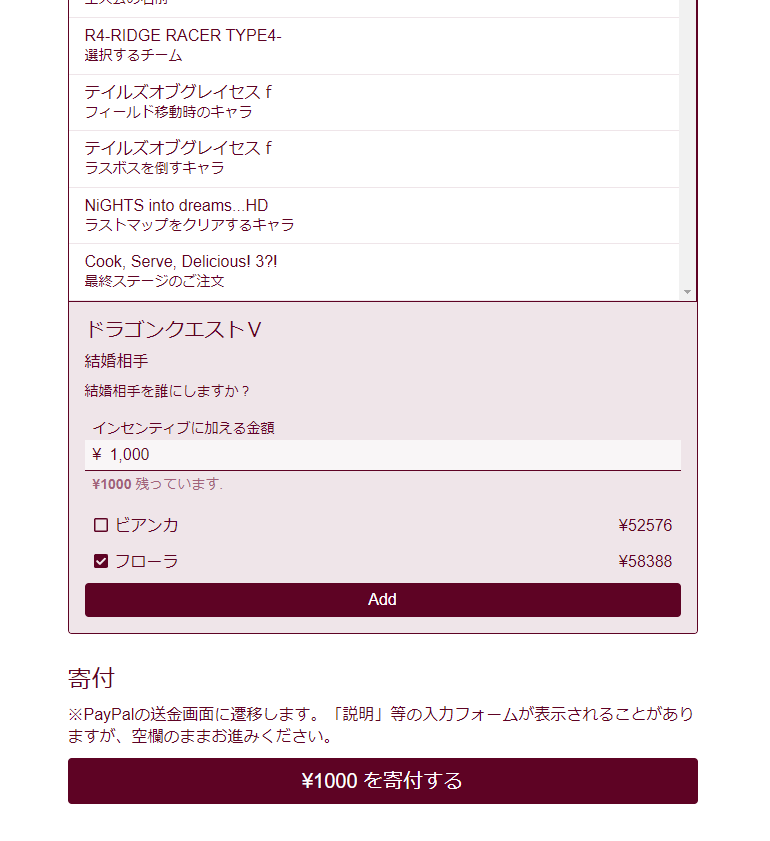 RTAinJAPAN Winter 今年はツイッターのアンケじゃなくて、国境なき医師団への寄付金でRTA中の一部の要素に要望だせるようになってるんだけどDQVのRTAへのリクエストで札束による場外乱闘がはじまってた… 今のところフローラ派有利