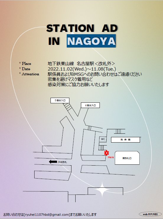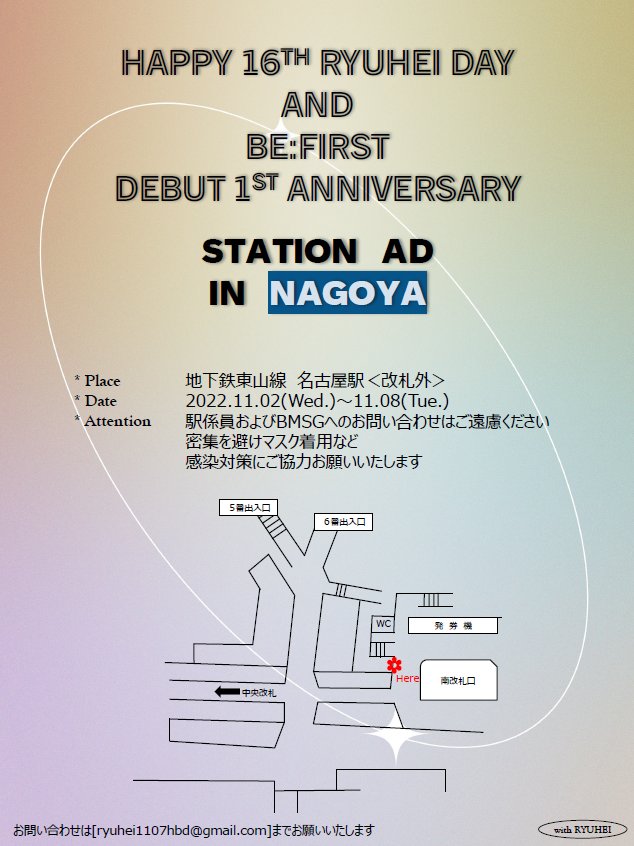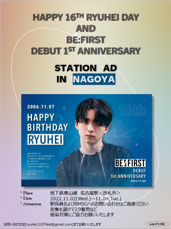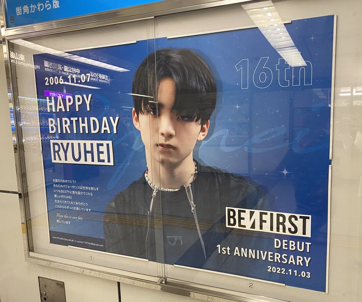 本日11/2より地下鉄名古屋駅〈改札外〉に、RYUHEIくんのお誕生日、BE:FIRSTのデビュー1周年のお祝いポスターが掲出されました!お立ち寄りの際には、ぜひ「#withRYUHEI_16thBD」のタグでつぶやいてくださると嬉しいです💙1週間よろしくお願いいたします🙌