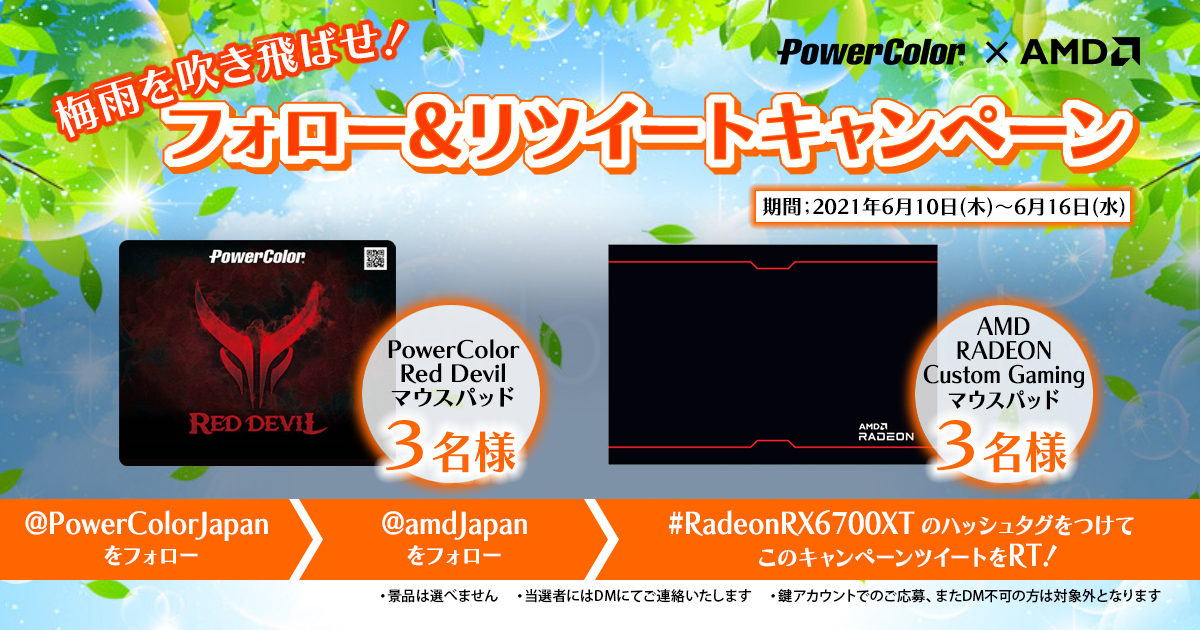 AMD Japanさんとのコラボキャンペーン!🎁 @PowerColorJapan@amdjapn の両アカウントをフォローして、このキャンペーンツイートを #RadeonRX6700XT のタグと一緒にコメントRT! どちらかのマウスパッドが抽選でもらえちゃいます! 🎉🎉🎉