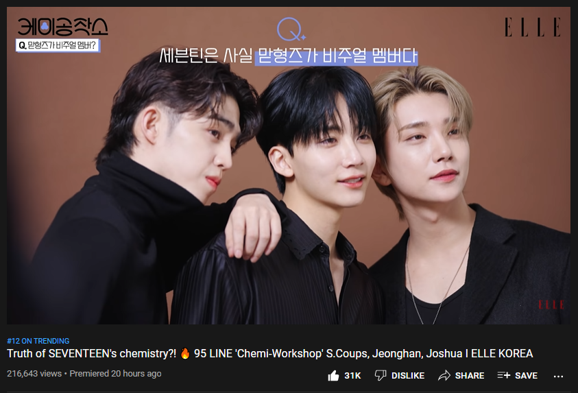 #SCOUPS, #JEONGHAN and #JOSHUA 's [95 LINE 'Chemi-Workshop'] on ELLE KOREA is currently trending at #12 on Youtube 🇰🇷 South Korea.