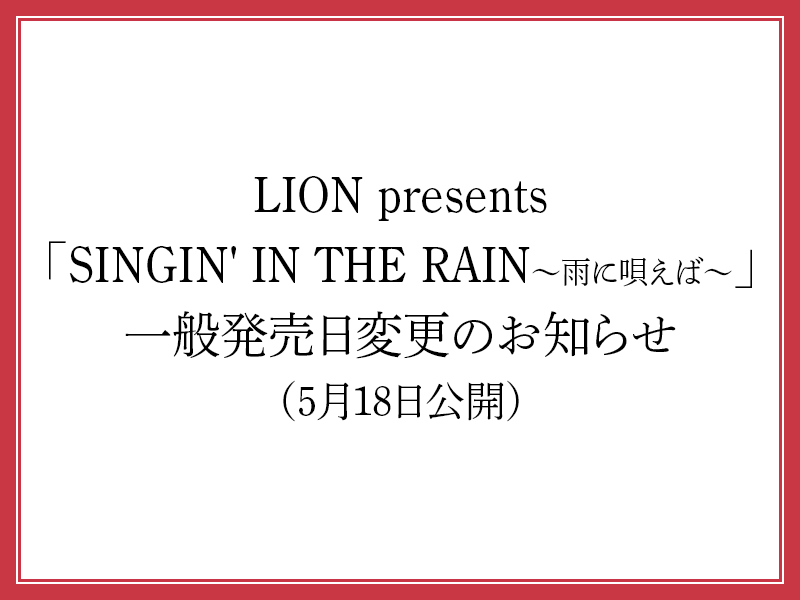 LION presents「SINGIN' IN THE RAIN~雨に唄えば~」の一般発売日につきまして、当初5/23(土)を予定しておりましたが、8/8(土)に変更させていただきます。