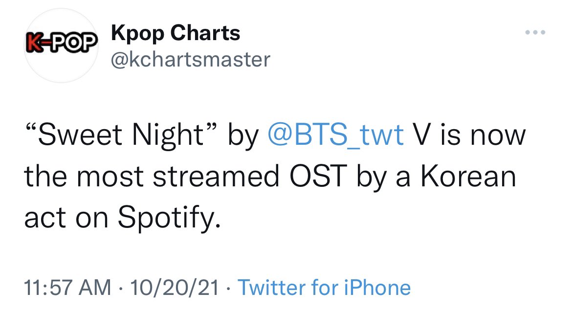 Sweet Night, produced, written, and composed by V is now the MOST streamed K-OST on Spotify