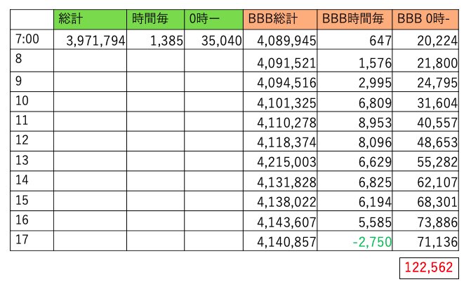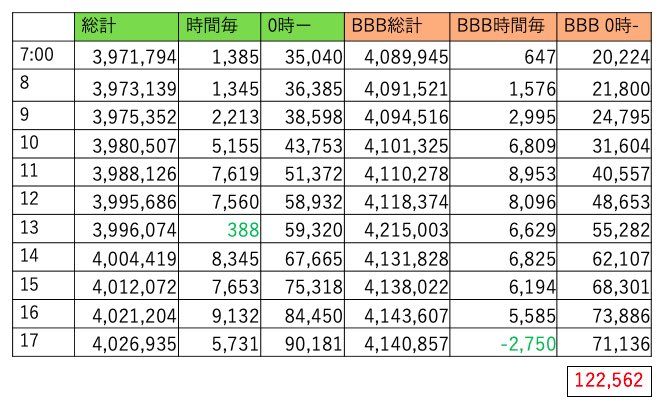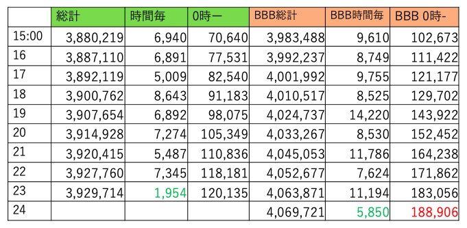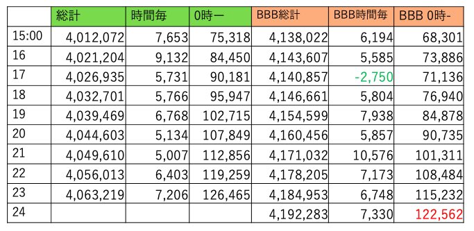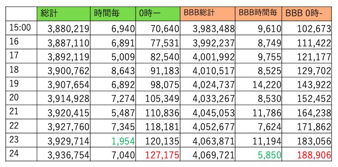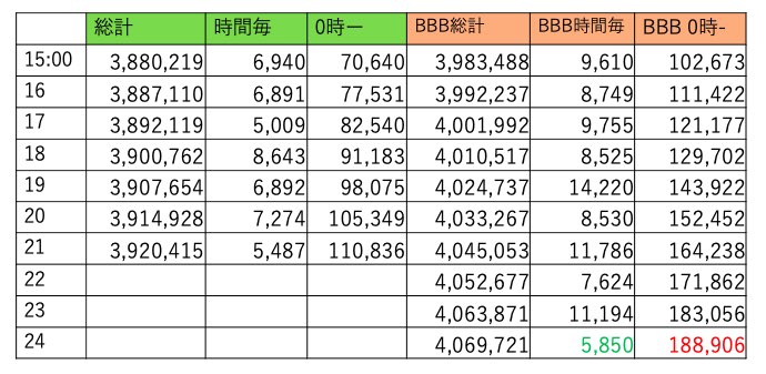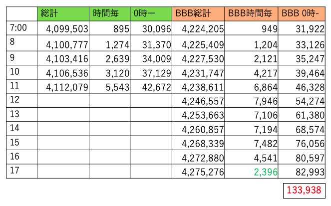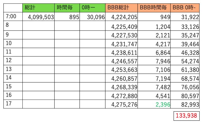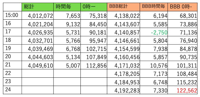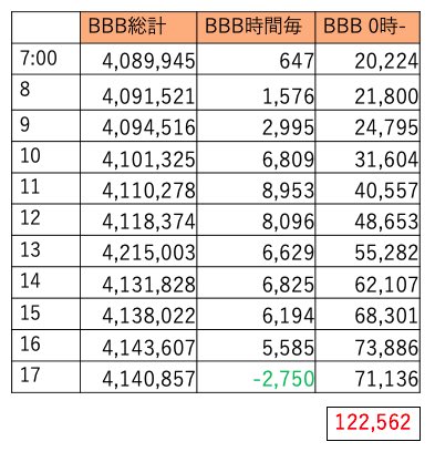 BBBは411万越えました。8時台に500くらい持ってかれてからこちら調整無いようです。