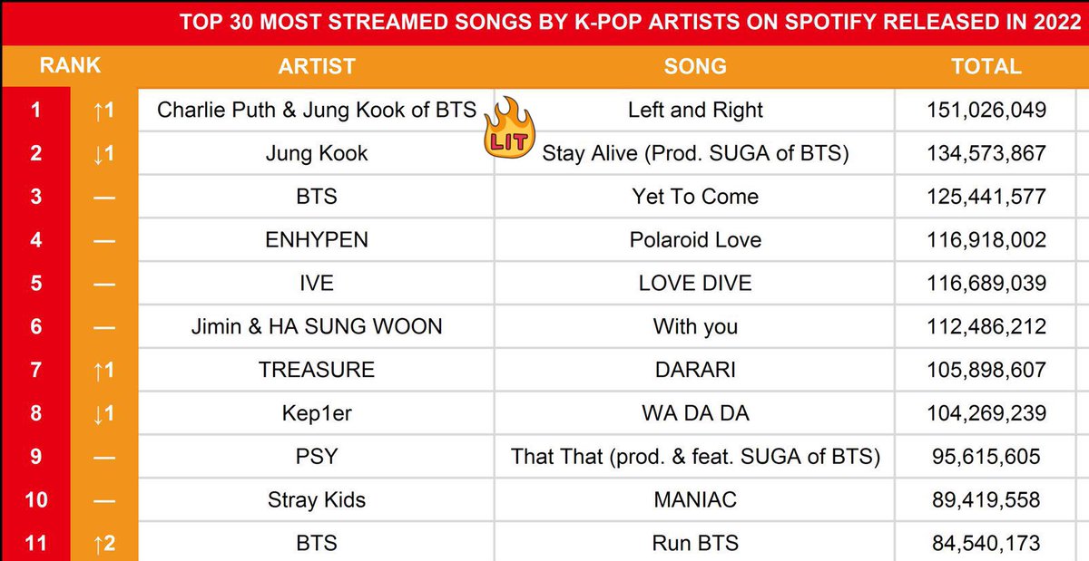 📊 “Left and Right” by @charlieputh and Jungkook is now the No.1 MOST STREAMED Song by a K-pop Act released in 2022.
