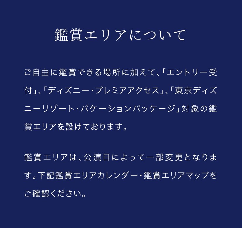 ご自由に鑑賞できる場所に加えて、「エントリー受付」、「ディズニー・プレミアアクセス」、「東京ディズニーリゾート・バケーションパッケージ」対象の鑑賞エリアが設けられます。