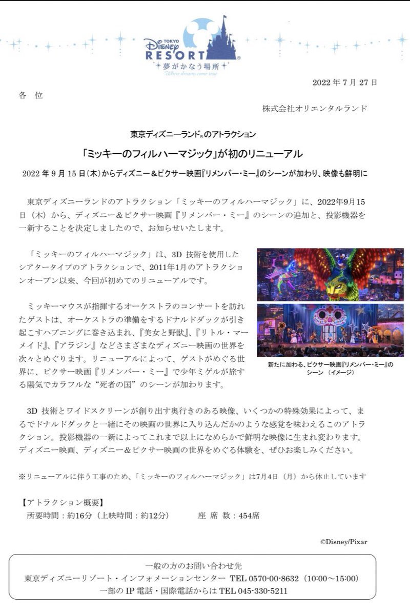2022 年 9 月 15 日(木)からディズニー&ピクサー映画『リメンバー・ミー』のシーンが加わり、映像も鮮明に。