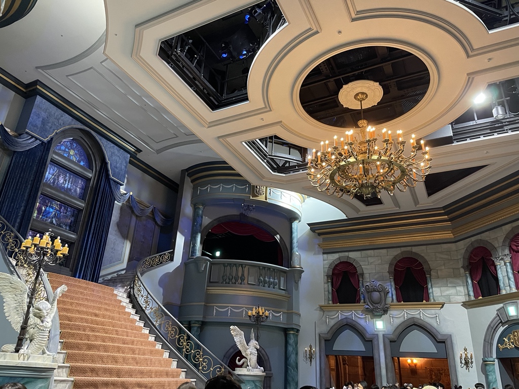 美女と野獣、外にいる人も中に避難するため、この部屋にみんな詰め込まれている感じ。照明も全て明るくなっている #TDR_now