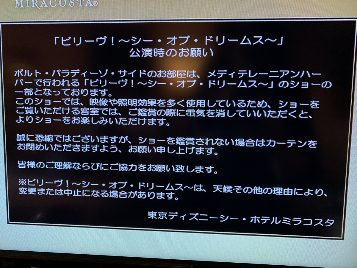 ミラコスタ宿泊者の方々へのお知らせに「ビリーヴ!〜シー・オブ・ドリームス〜」公演時のお願い が出ていました。