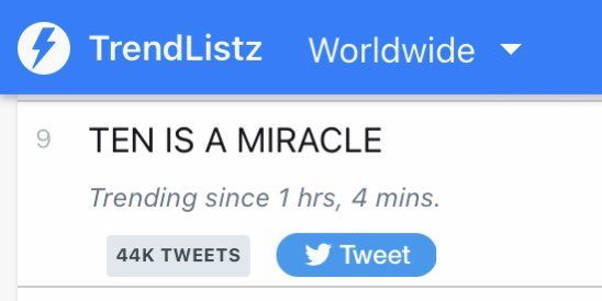 ตอนนี้ TEN IS A MIRACLE กำลังขึ้นเทรนทวิตเตอร์ อันดับที่ 8 ของ Worldwide Trend ค่ะ ✨