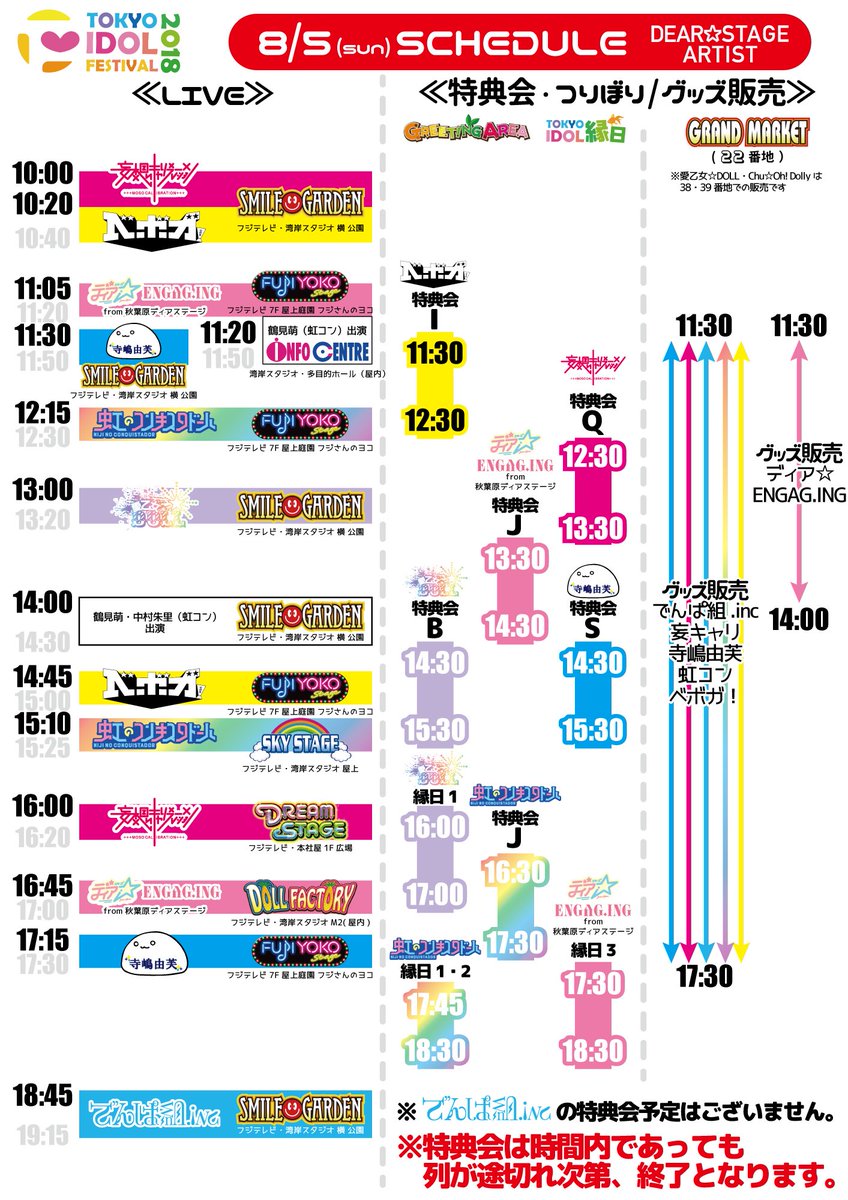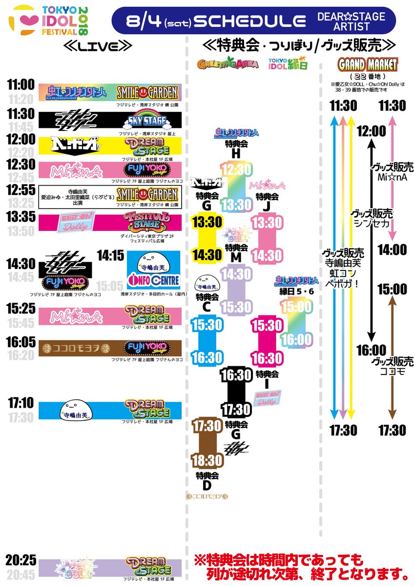 遂に明日8/3よりお台場の夏の風物詩「TOKYO IDOL FESTIVAL 2018」が開催になります🎉DEARSTAGE所属アーティストのスケジュールはこの画像でチェック🔎グッズはGRAND MARKETの22番地にて販売いたします🛒体調に気を付けてライブに特典会にと一緒に楽しみましょう😆