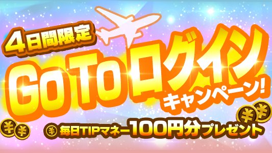 7/23〜26日の4連休限定!ログインするだけで「TIPマネー100円分」が毎日もれなく全員もらえます!東京も除外しません!