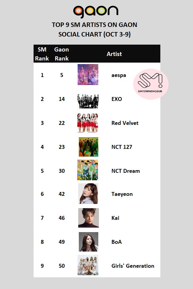 Top 9 SM Artists on Gaon Social Chart (Oct.10-16)