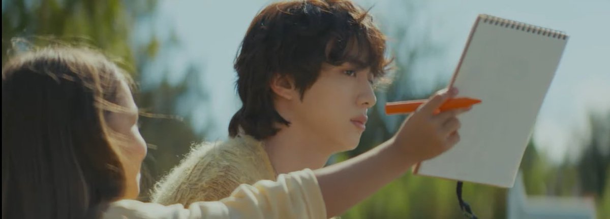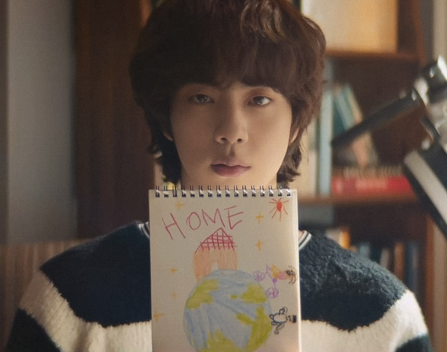 A criança desenhou a Terra, o Jin, ela na bicicleta e escreveu "Home"😭😭😭
