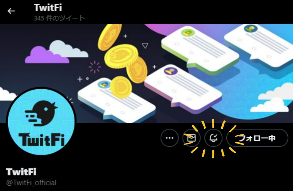 基本的ですが意外と忘れている設定。#TwitFi ユーザーの皆さんは運営のTweet通知をオンにしていますか??TwitFi運営は基本Tweetでしか案内しないので、聞き逃すと大きな流れを逃してしまうことに繋がります。私は他にもTwitFi関連の考察Tweetをされている方の通知もオンにして情報を追っています。
