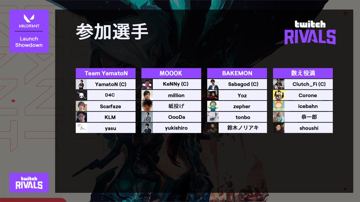 #VALORANT 正式リリースを記念したこのイベントは、世界中で開催されます。日本からはTwitchストリーマーで構成されたこちらの4チームが参戦。国内で優勝するのはどのチームか。刮目せよ。