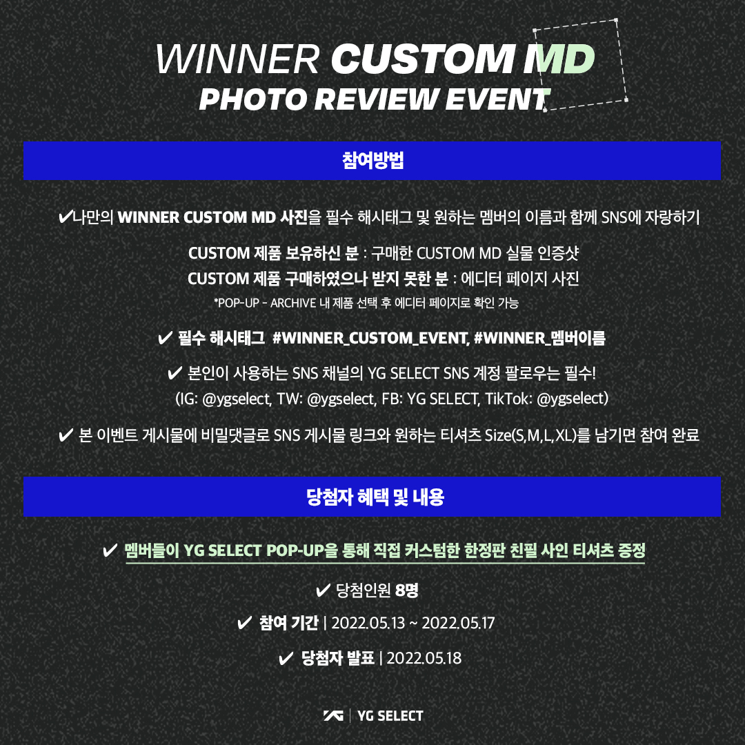 WINNER CUSTOM MD 인증샷을 필수 해시태그 #WINNER_CUSTOM_EVENT 와 함께 SNS에 자랑해주시면 8명을 추첨하여 WINNER의 친필 사인 티셔츠를 선물로 드립니다. 지금 바로 #YGSELECT 에서 확인해보세요!