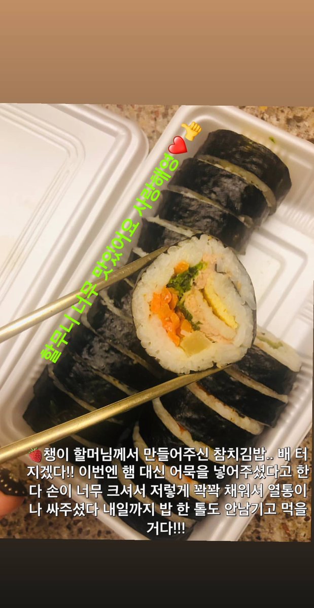 난 오늘 챙이 할머니가 만들어주신 김밥 엄청 많이 먹어서...너무 행복해...🐷아..사진 찍을걸..ㅋㅋ