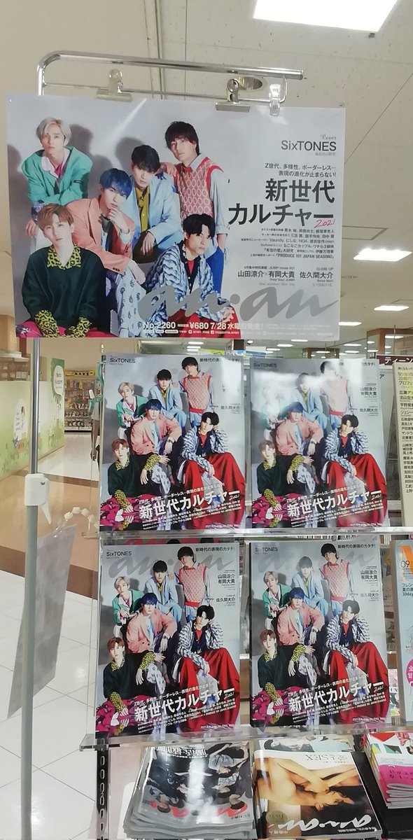 SixTONES が表紙のanan2180号、本日発売です。黒です、超かっこいいです! 気合いを入れて100冊入荷し、大きく展開しています。が、開店時からどんどん売れています!Jr.としては最後の表紙ですね。ぜひ店頭にて売場をご覧ください。お電話でのお取り置きも承ります。#anansixtones