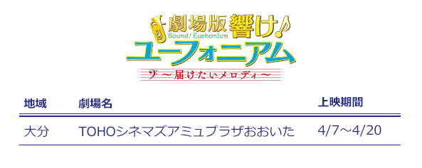 4/7(土)~4/20(金)に、TOHOシネマズアミュプラザおおいたにて『劇場版 響け!ユーフォニアム~届けたいメロディ~』の上映が決定しました!ご来場をお待ちしております!