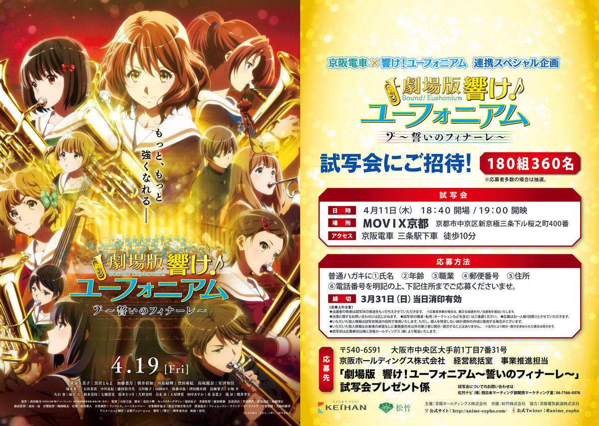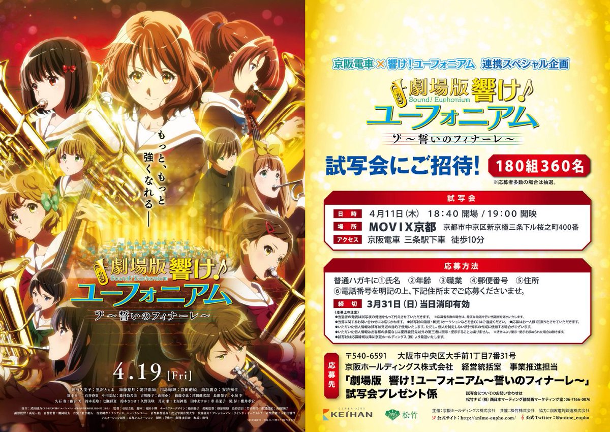 「京阪電車」と「響け!ユーフォニアム」のコラボによる、『劇場版 響け!ユーフォニアム~誓いのフィナーレ~』試写会の開催が決定しました!