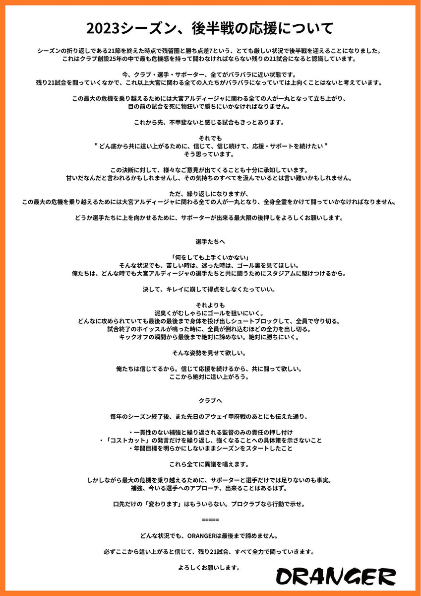ホームクラブとして、多くの方々にご迷惑とご心配をお掛けしたことについて、お詫び申し上げます。