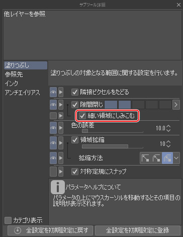 [塗りつぶし]ツールは、指定された領域を塗りつぶすためのツールです。そのままでも便利ですが、参照するレイヤーや塗りつぶし方法を設定すれば、複雑な線画も簡単に塗りつぶせます。