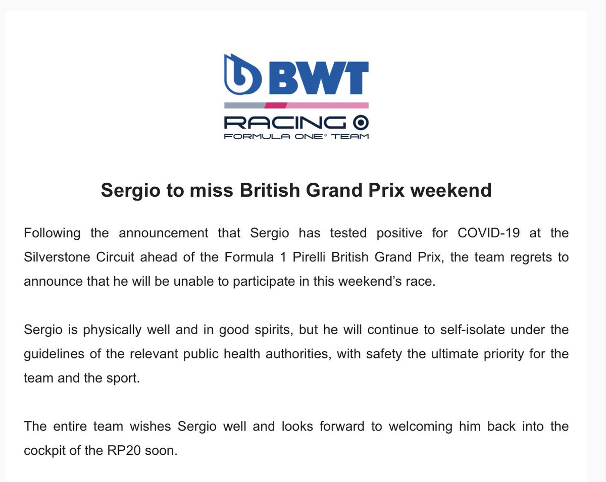 ドライバーにも、とうとう感染者が出ました。自主隔離中のペレスは、来週の70周年GPも欠場になります。「濃厚接触者は完全に突き止め、レース開催への影響はない」と、FIAとリバティは中止の意向は全く考えてないようです。#f1jp