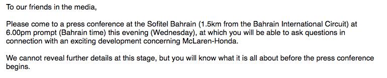 マクラーレンから、突然の重大発表予告。6時の記者会見に来いと。「詳細は明かせないが、マクラーレン・ホンダのエキサイティングな今後について」だそうな。何でしょうねえ・・。#f1jp