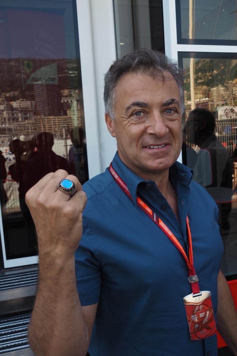 アレジにインディ500の話を聴いてたら、「ほ〜ら、これ」と、自慢気に指輪を見せびらかしてきました。インディ500出場ドライバーだけに、スタート直前のグリッドセレモニーで与えられるんだそうな。#f1jp