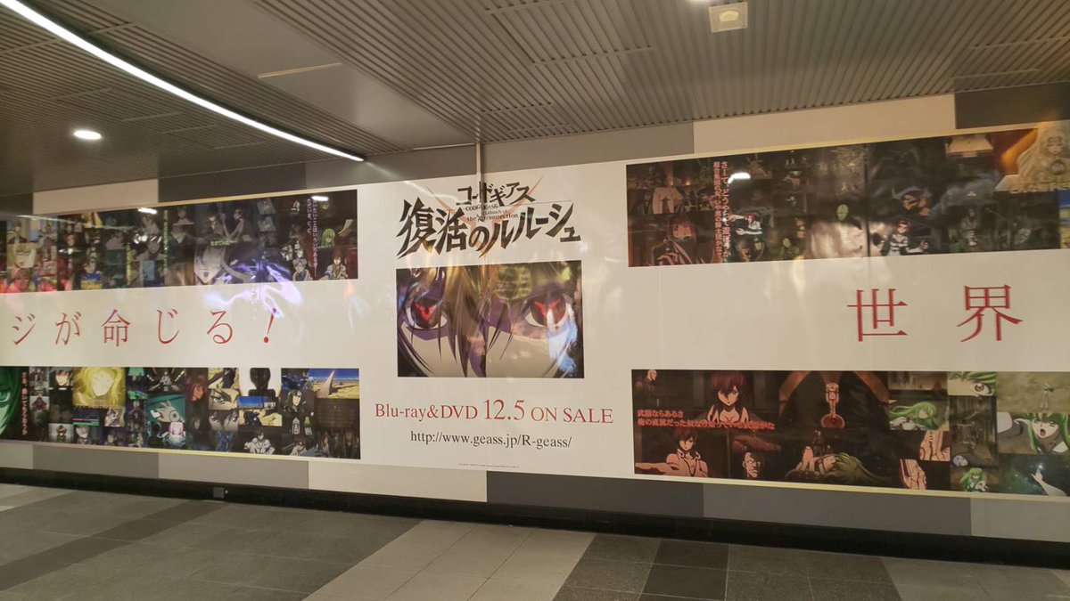 【大型広告展開中!】12/5発売「コードギアス 復活のルルーシュ」BD&DVDの大型広告を、東京メトロ半蔵門線渋谷駅地下通路にて展開中!「復活のルルーシュ」を振り返れるデザインです。お近くにお越しの際はぜひご覧下さい! #geassp