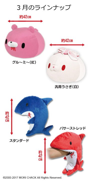 チャックスGP4月のラインナップは、春っぽく随所に花柄をちりばめたグル~ミ~&汎用うさぎのぬいぐるみと、あの大好評だったグル~ミ~6Cアソートの噛み付いて離さないポーズのキーチェーンです。先月の特大クッションと特大スリットギルもまだどこかにあるはず!