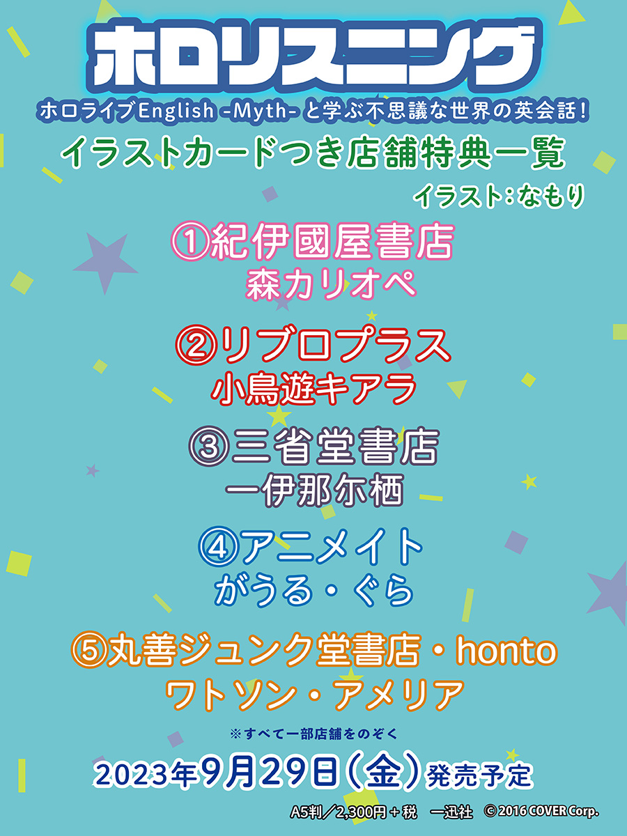 『ホロリスニング』 大人気につき店舗特典が決定いたしました✨ 特典はなもり先生が手掛けた表紙絵を使ったイラストカードです💕推しタレントの店舗で購入するもよし!コンプリートするもよし! 特典はなくなり次第終了いたしますので、予約がおすすめ☆ご予約お待ちしております☺ #holoMythと英会話