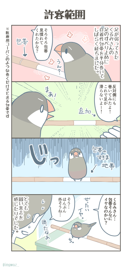 毎年な感じですが、6月9月に体調を崩す文鳥さんが多いので再掲まんがです。季節の変わり目、早めのサーモ&ヒーターの設置。