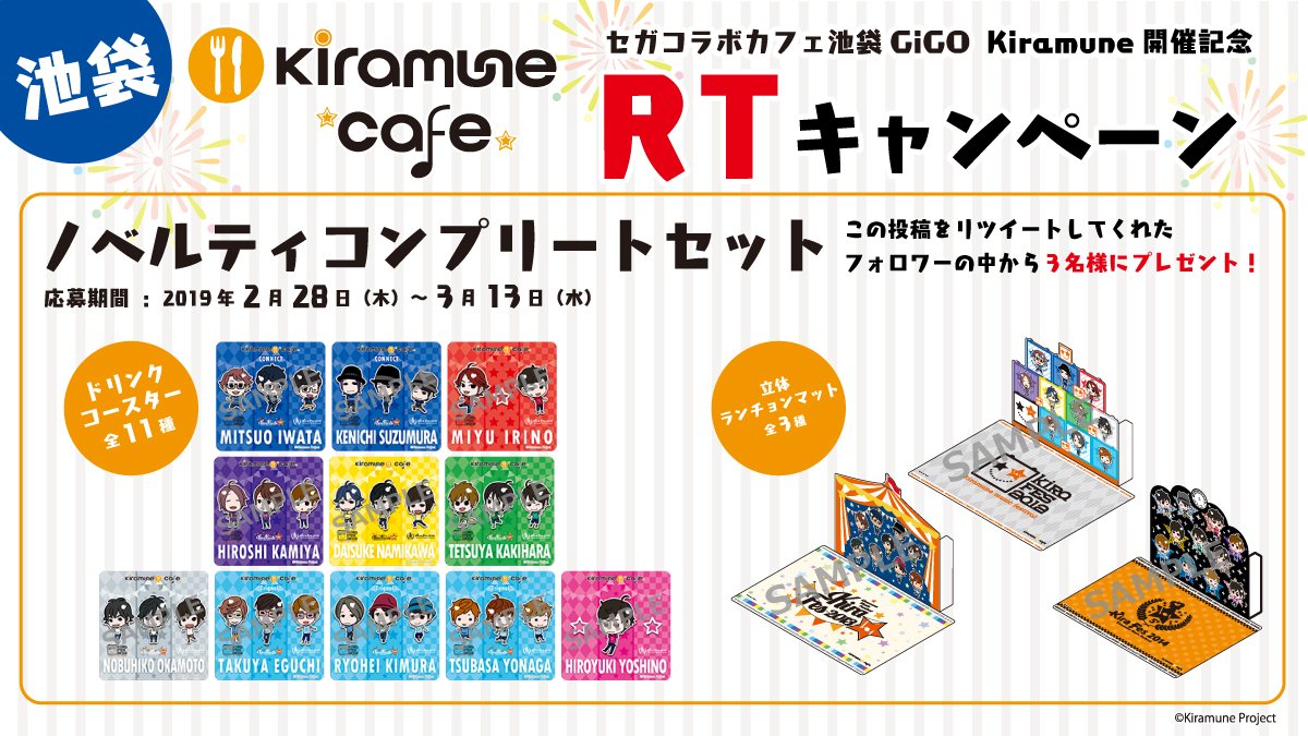 「セガコラボカフェ Kiramune cafe」開催を記念してRTキャンペーンを開催!このツイートを対象期間中にRTしたフォロワーの中から抽選で3名様にコンプセットをプレゼント☆詳細⇒tempo.sega.jp/Kiramune/cafe2… #kiramune