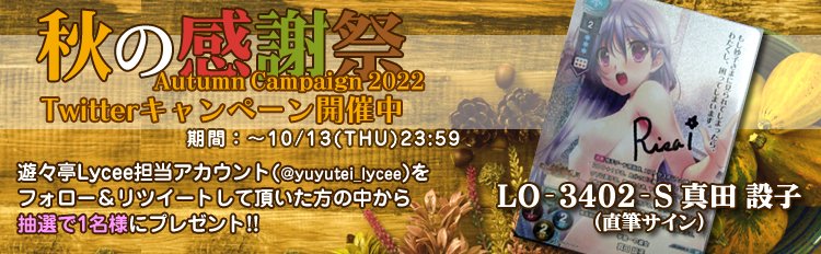 遊々亭Twitterキャンペーン!このアカウントをフォローし、本ツイートを公式RTして頂いた方から1名様に「直筆サインカード LO-3402-S 真田 設子」をプレゼント! #lyceetcg yuyu-tei.jp/game_lo/