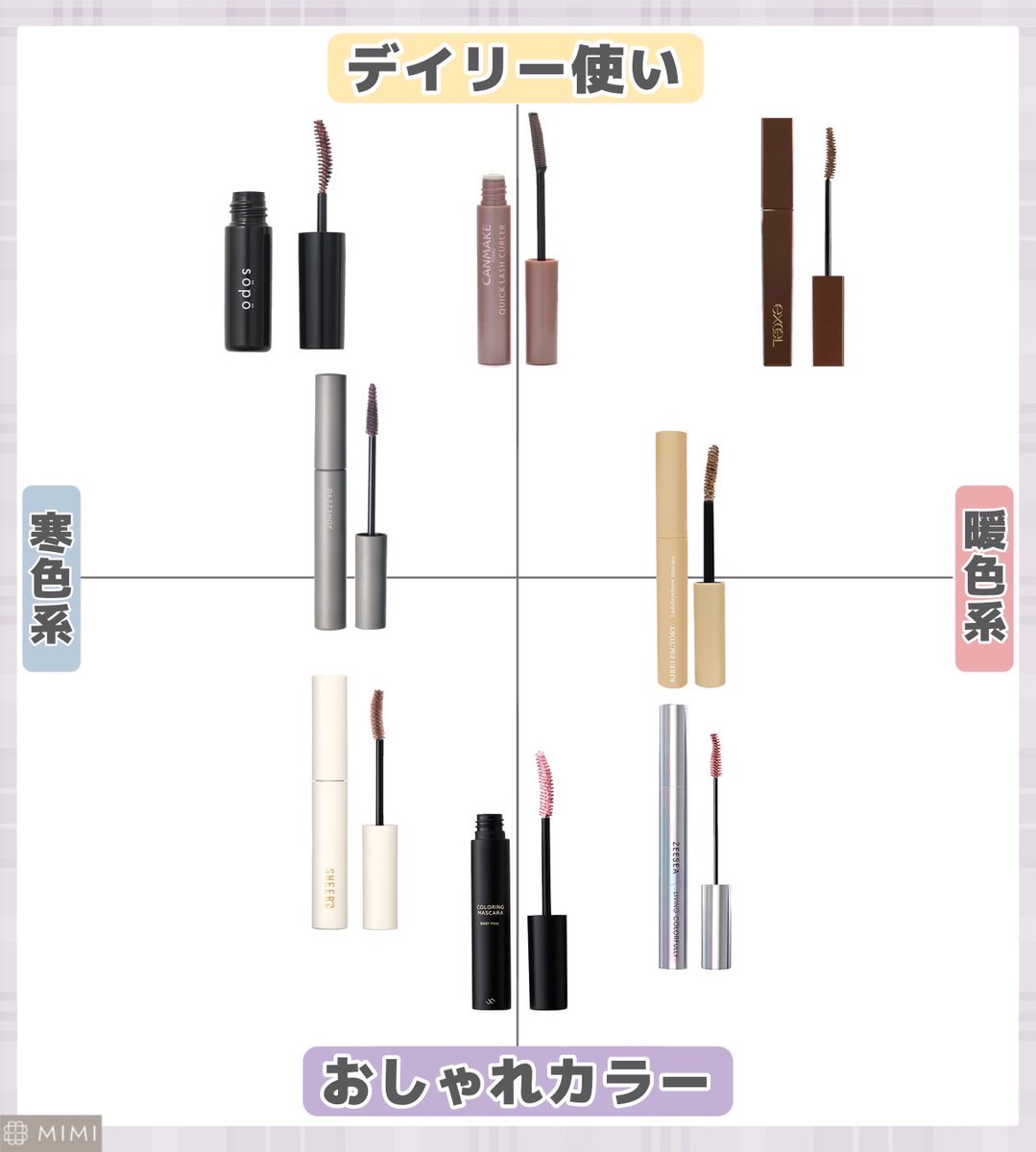 ブルベさんの普段使いには、DAZZSHOPやsopoのモーヴ系くすみカラーが可愛い🤍キャンメイク クイックラッシュカーラーの限定色モカグレージュは、取り入れやすい絶妙カラー。6/14発売のエクセルの限定色は、儚げな目元に仕上がるダスティベージュ。