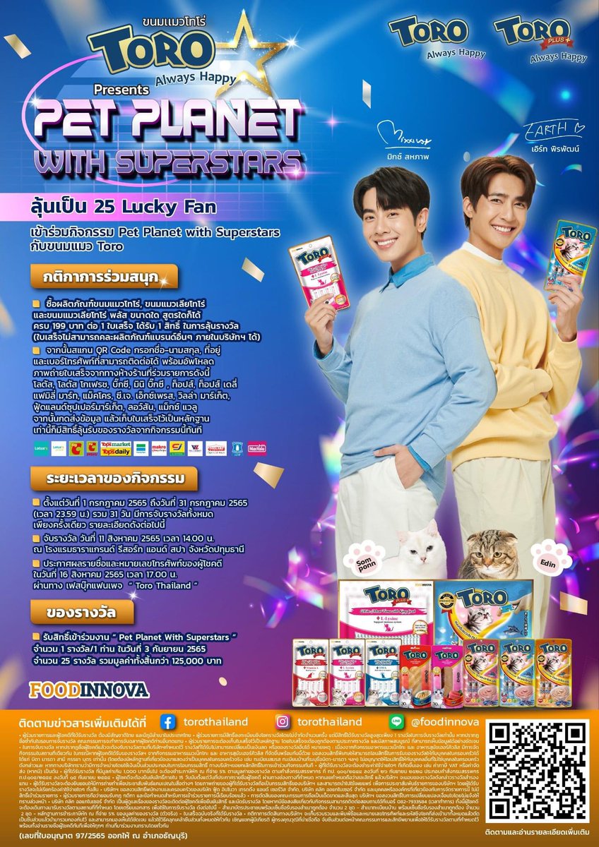 กติกา : ซื้อขนมแมวโทโร่ครบ 199 บาทต่อ 1 ใบเสร็จ รับ 1 สิทธิ์ในการลุ้นรางวัล