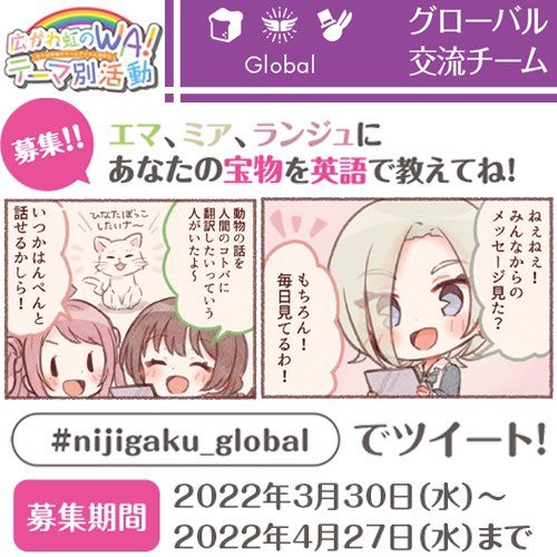 Tweet about that special something you consider as a treasure in English, with the hashtag #nijigaku_global.