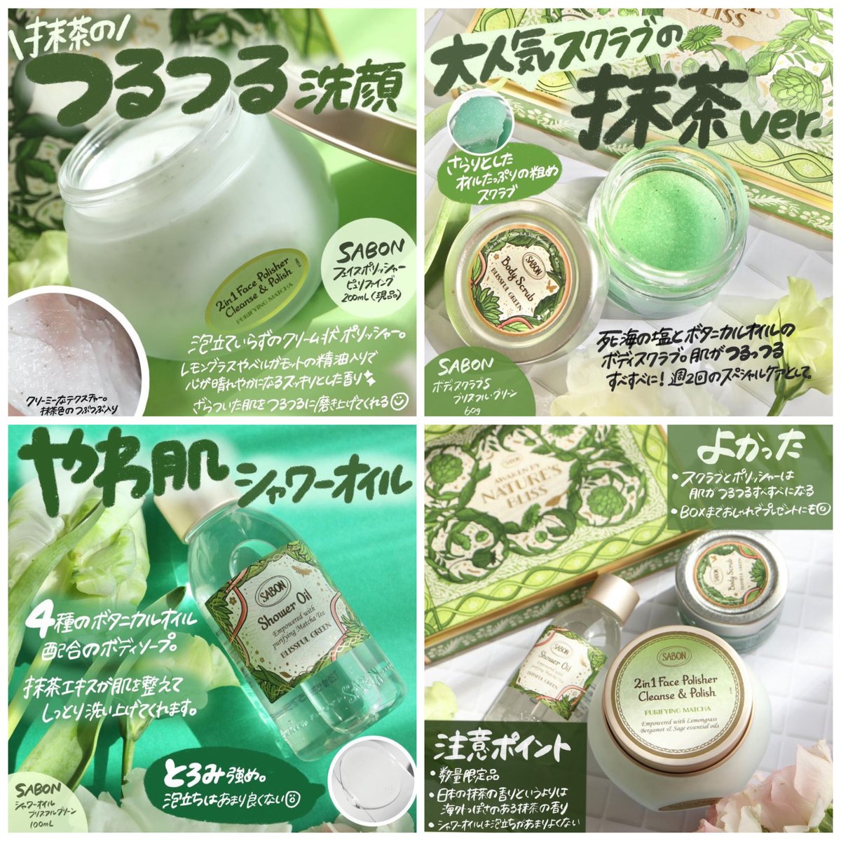 SABONの抹茶ボディケア🍃【ピュリファイキットブリスフル・グリーン】は抹茶の香りのフェイスポリッシャーやボディスクラブ、シャワーオイルのセット🍀BOXもおしゃれでプレゼントにも◎です☺️セットの他ハンドクリームやフレグランスもあります✨instagram.com/p/CNTc093lLRe/
