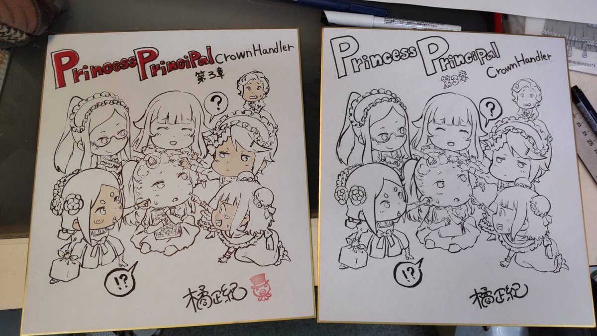 この色紙、筆で描いた後物足りなくなってしまい、制作に「やっぱ色付きの方が良いかなぁ」って聞いたら「色付きが良いです!」と即答されたのでコピックで色を塗ってみたらベアトのお顔に墨が滲んで修復不能に。