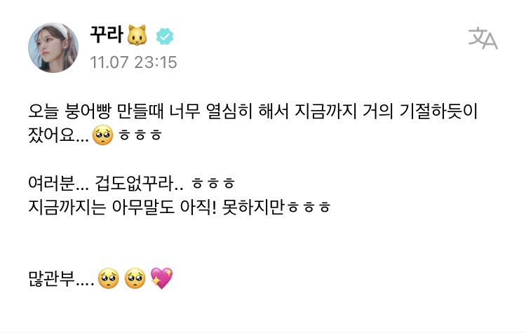 🐱 i worked really hard making bungeobbang today that i felt like i was about to faint and was asleep till now…🥺hehe everyone... "looks like kkura's fearless".. hehe even though! i couldn't say anything about it until now hehe look forward to it..🥺🥺💖