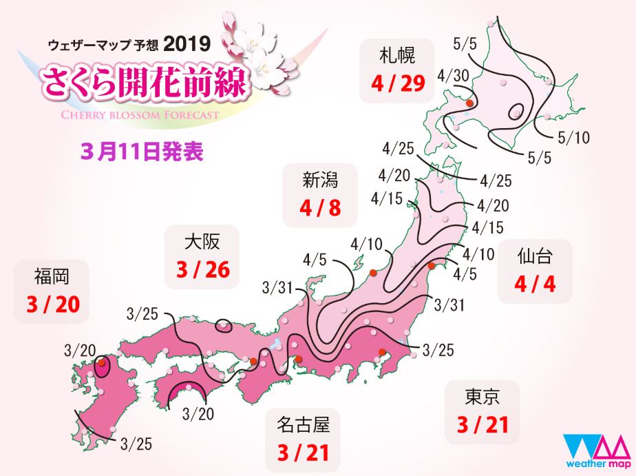 さくら開花前線は3/20頃に福岡・高知からスタートし、3/21頃に東京・名古屋に開花、京都は3/24、大阪は3/26頃の開花予想です。