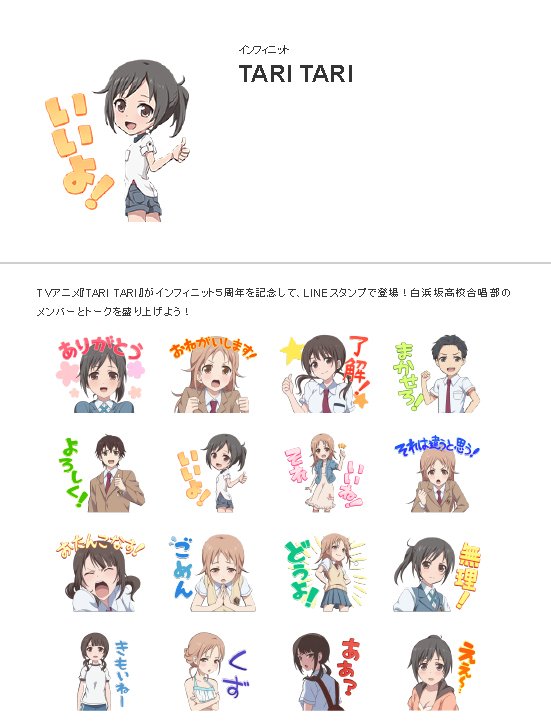 株式会社インフィニットから『TARI TAR』のLINEスタンプがリリースされました! 白浜坂高校合唱部のメンバーと一緒に、トークを盛り上げたり罵られたり!? store.line.me/stickershop/pr… #taritari