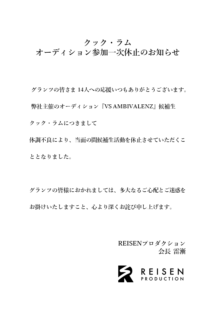 『クック・ラム オーディション参加復帰のお知らせ』