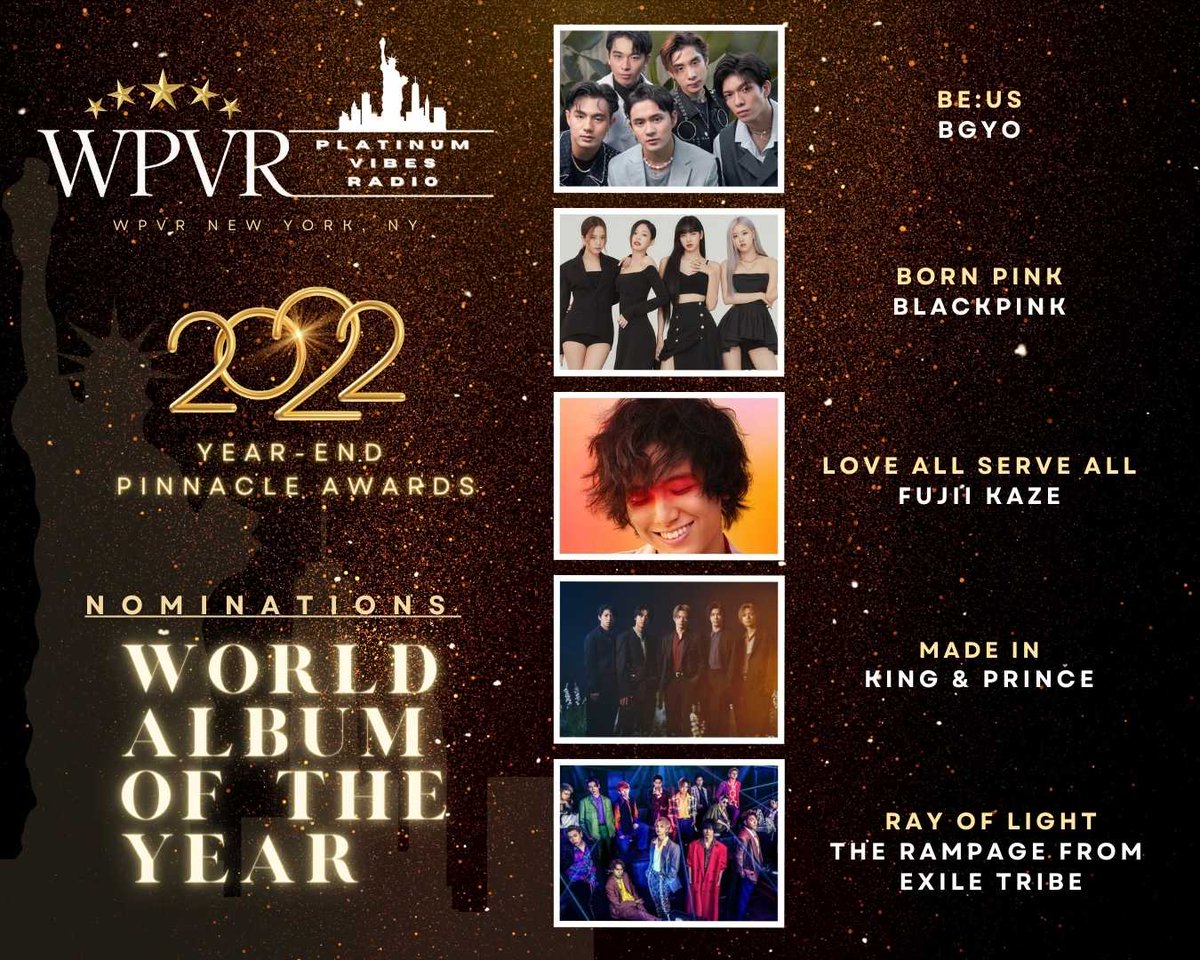 💥✅ Hey WPVR World! The FAN VOTE BALLOT for the WPVR Pinnacle Awards is now open! Get your vote(s) in at platinumvibesradio.com/wpvr-2022-pinn…. Thank you! @justinbieber @BLACKPINK @SB19Official @arashi5official @kingandprince_j @agnezmo @tomosfam @BTS_twt #wpvr #pinnacleawards #fanvotes