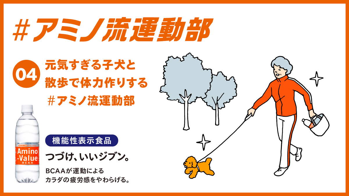 飼い始めた子犬が元気すぎて、毎日の散歩もなかなかの運動に。🐕せっかくだからついでに体力作り! 散歩のお供には、 #アミノバリュー です。